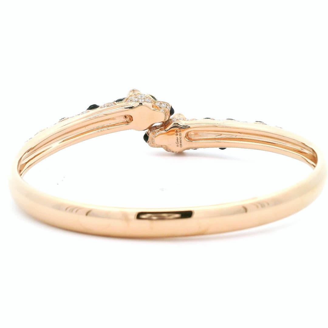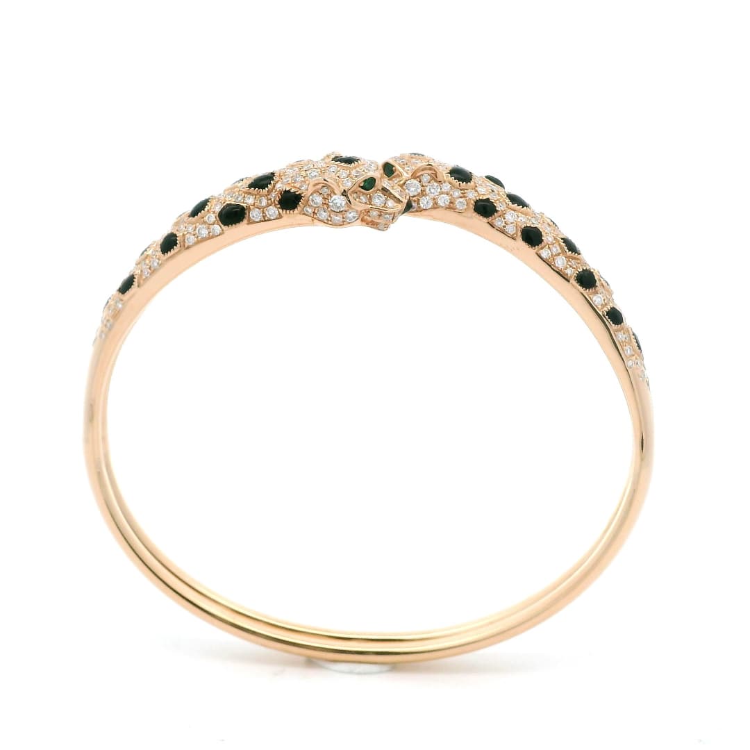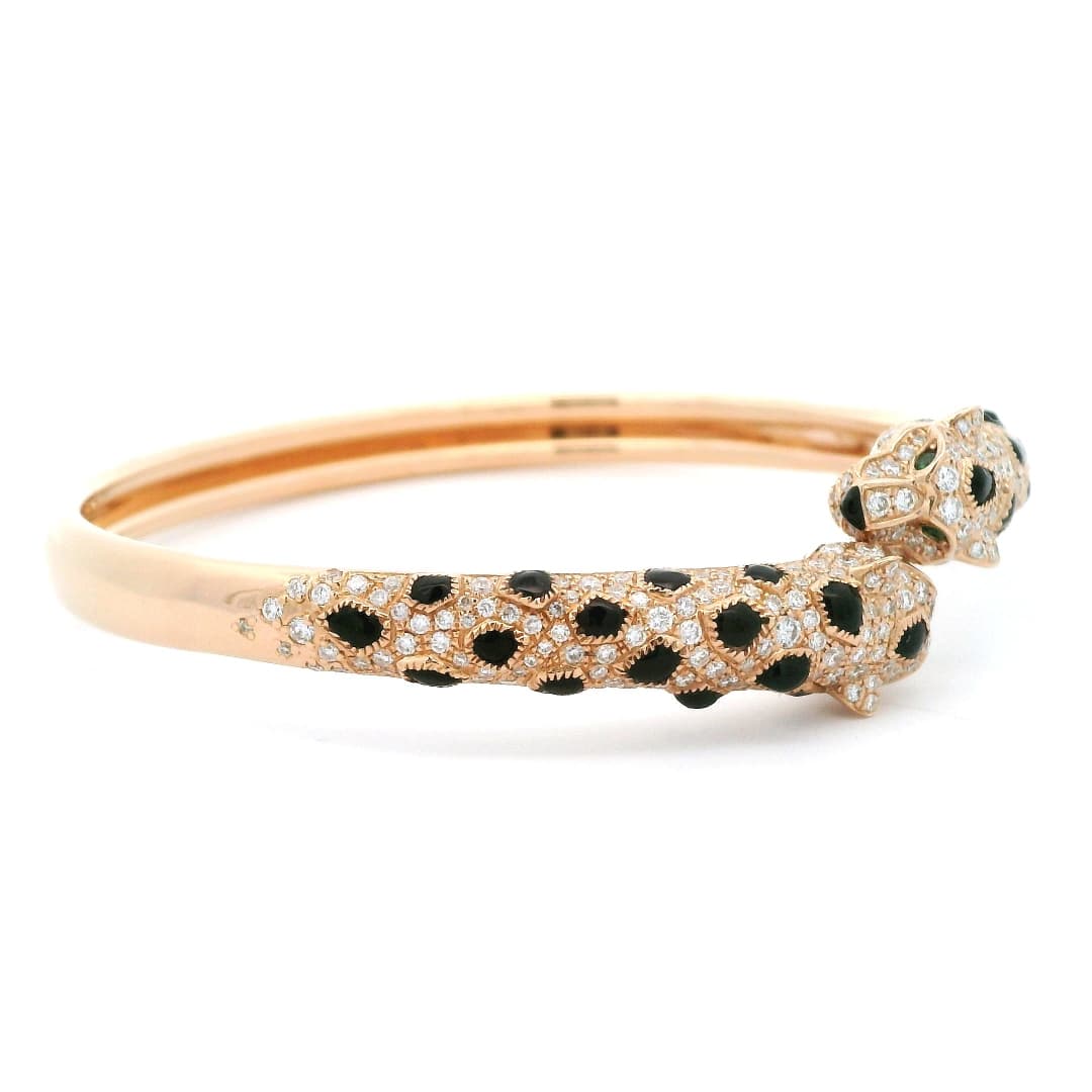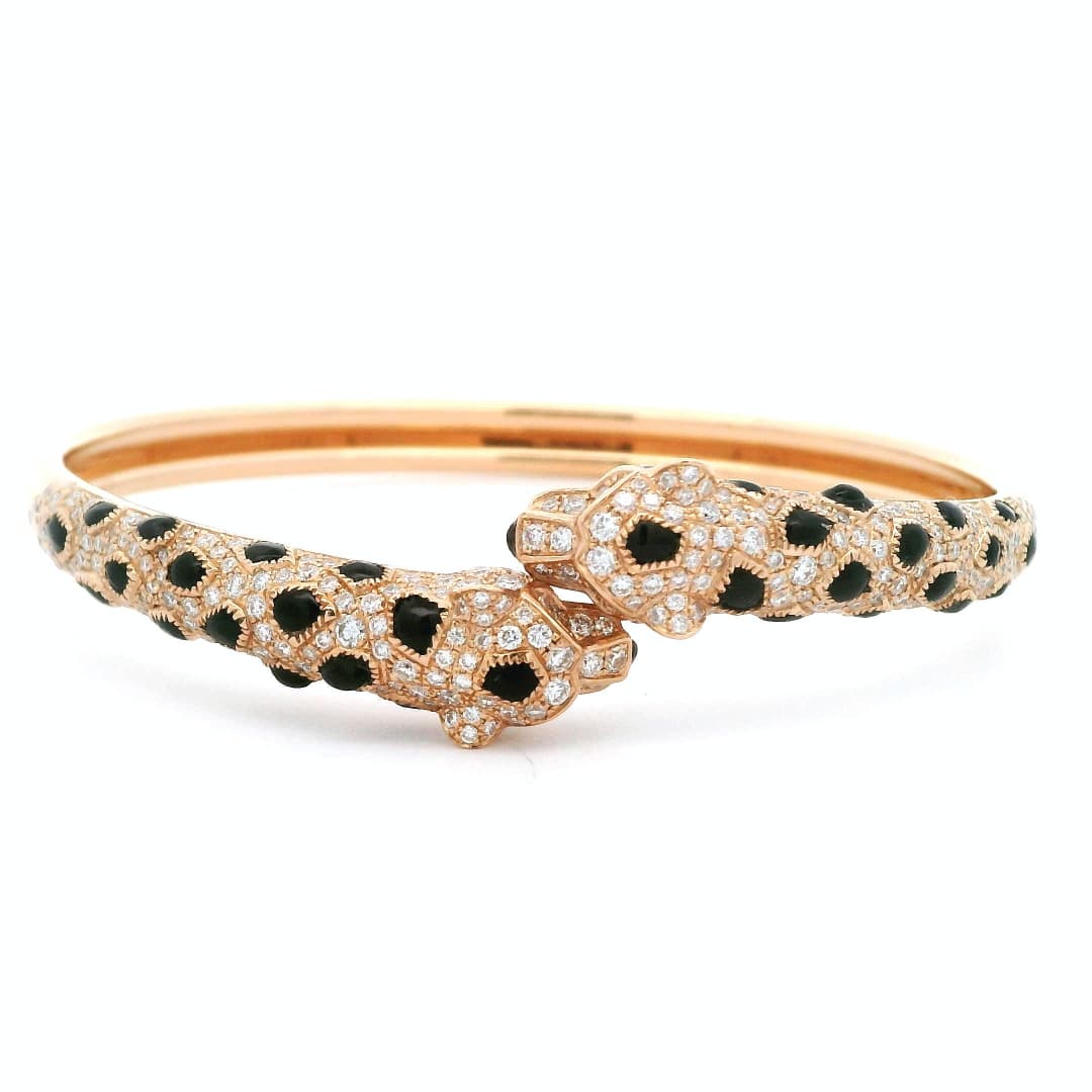 The Panthère de Cartier, a symbol of strength and elegance, is one of Cartier’s most iconic creations. Crafted from solid 18K gold and set with fine-cut diamonds and onyx details, this Luxury Cartier Panther Diamond Bangle embodies elegance and timeless allure.