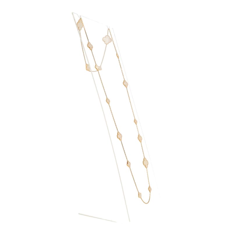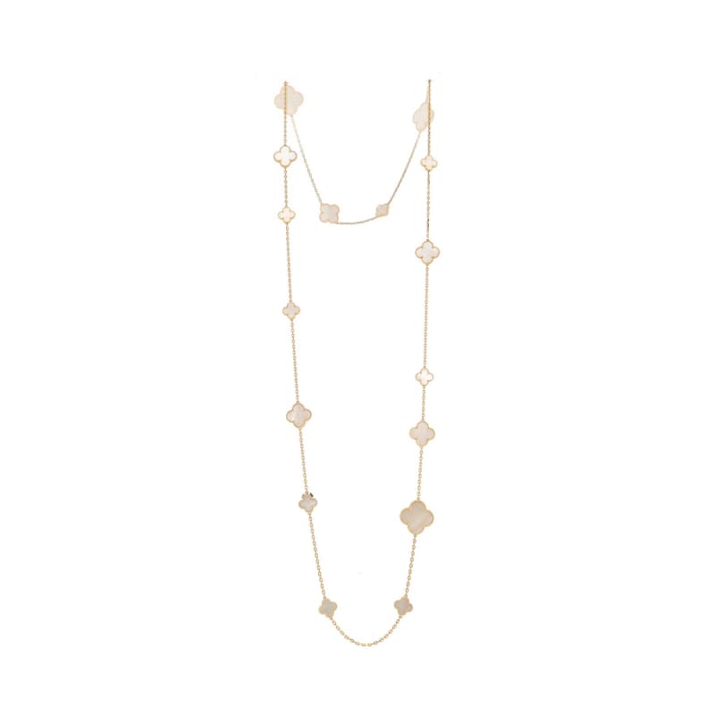This Replica 18K Gold Women Necklace is inspired by the classic four-leaf clover design. Crafted in luxurious 18K gold and adorned with lustrous mother-of-pearl, each four-leaf clover motif showcases exquisite craftsmanship and elegant beauty. Featuring a unique design with 16 four-leaf clover patterns, the necklace is both bold and elegant, making it a perfect choice for everyday wear and special occasions.