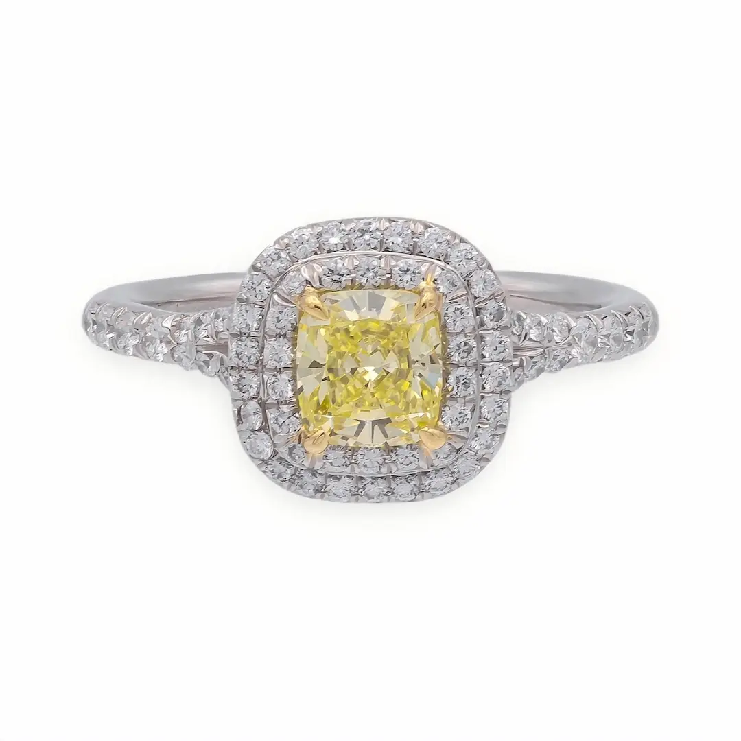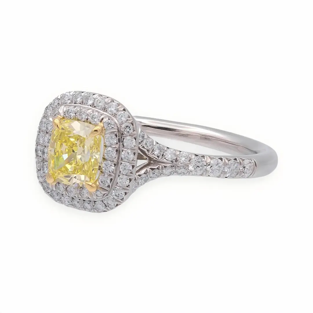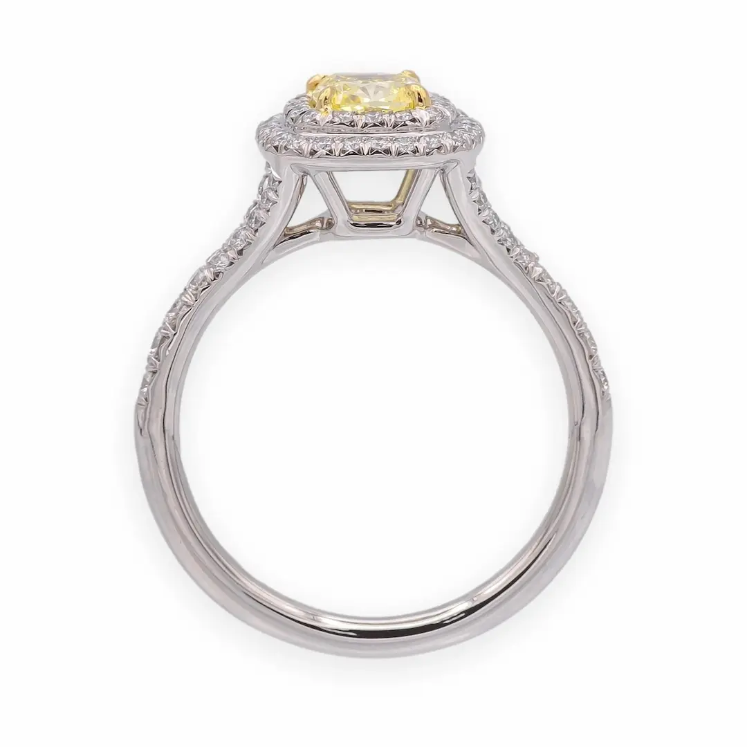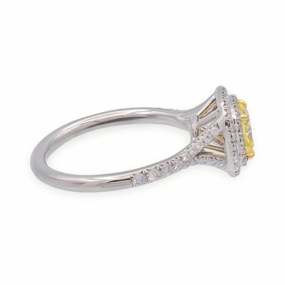 Surrounded by a delicate halo of smaller diamonds and complemented by pavé-set side stones (approx. 0.4ct), the design enhances overall sparkle while emphasizing the rich color of the center stone. It’s an ideal choice for those searching for a yellow diamond engagement ring, cushion cut halo ring, lab grown diamond ring, or unique engagement rings.