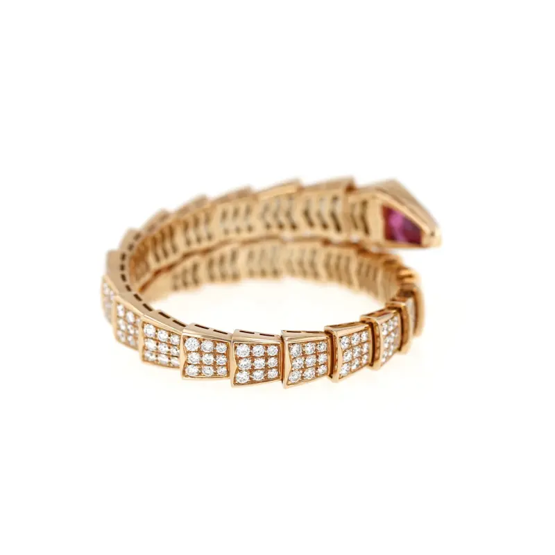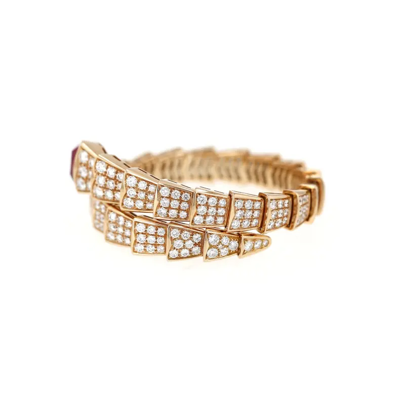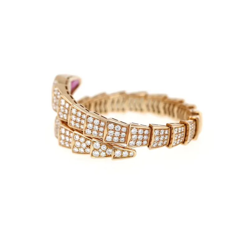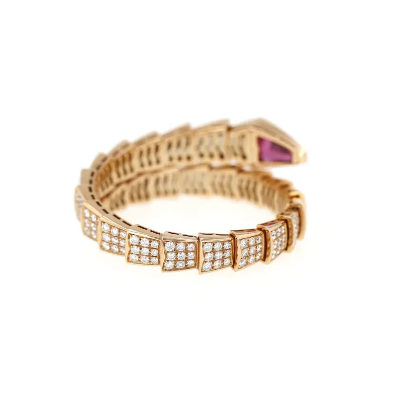 This Cheap 18K Gold Bulgari Serpenti Viper Bracelet, crafted from pink gold, diamonds, and tourmaline, includes a beautifully geometrically coiled pink gold serpent bracelet set with a total of 7.44 carats of brilliant-cut diamonds, and the serpent’s head adorned with a faceted pink tourmaline design.