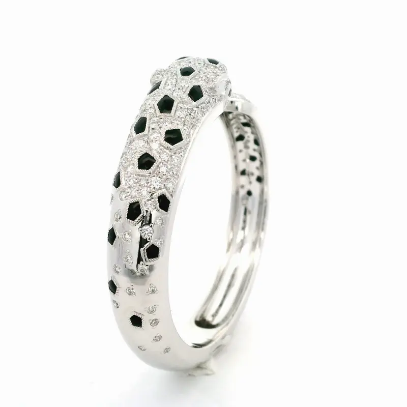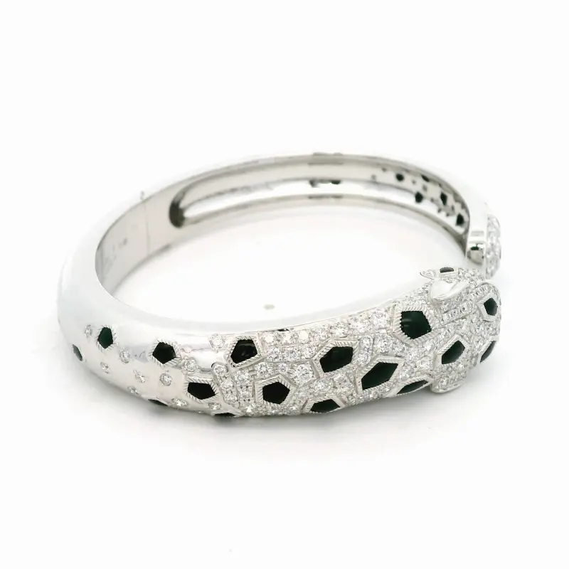 This Replica 18K Gold Cartie Jewelry semi-paved bracelet is crafted from onyx, complemented by 18K white gold fittings and diamonds. It features two emerald-cut diamonds and 225 brilliant-cut diamonds totaling 2.55 carats. The bracelet has a hinged design with a hidden clasp on the side for easy wear.