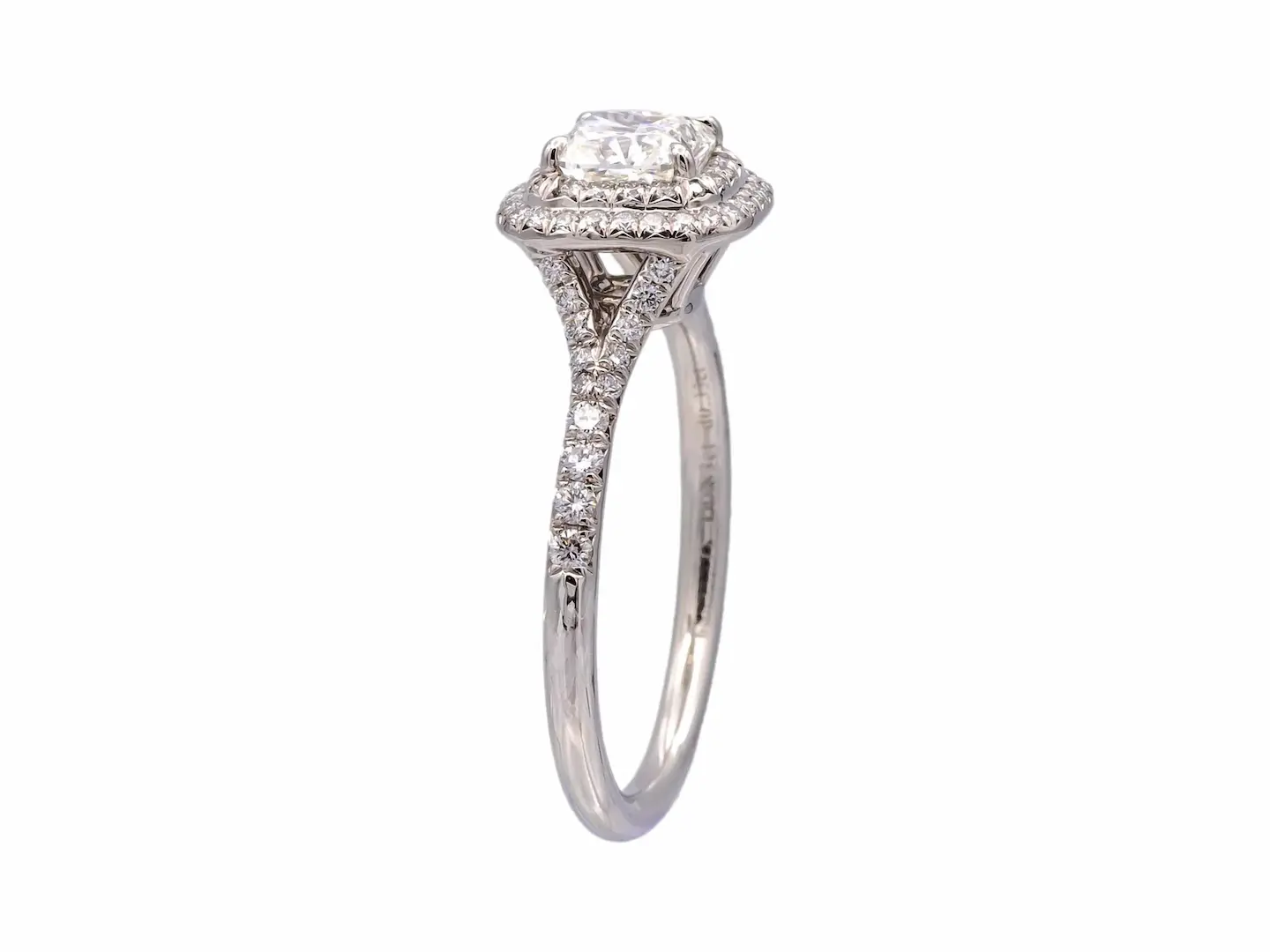 Surrounded by a delicate halo of smaller diamonds and complemented by pavé-set side stones (approx. 0.4ct), it enhances the overall sparkle, making it a perfect choice for those searching for lab diamond engagement ring, cushion cut diamond ring, halo engagement ring, and affordable luxury engagement rings.