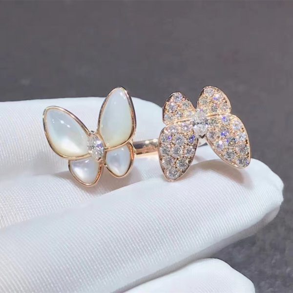 Van Cleef & Arpels Two Butterfly Between the Finger ring, rose gold, white mother-of-pearl, round diamonds, white gold, marquise diamonds, diamond quality DEF, IF to VVS.